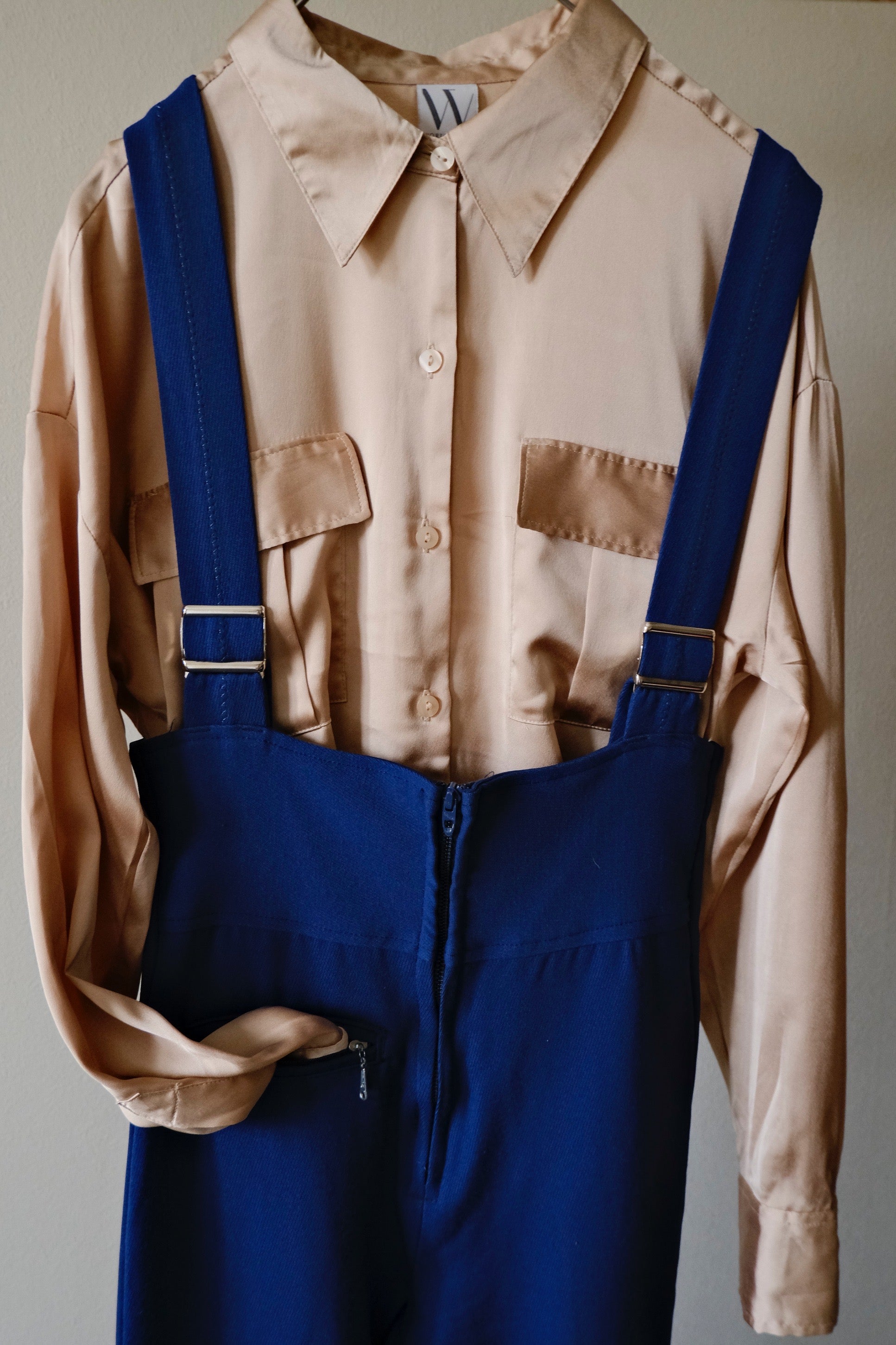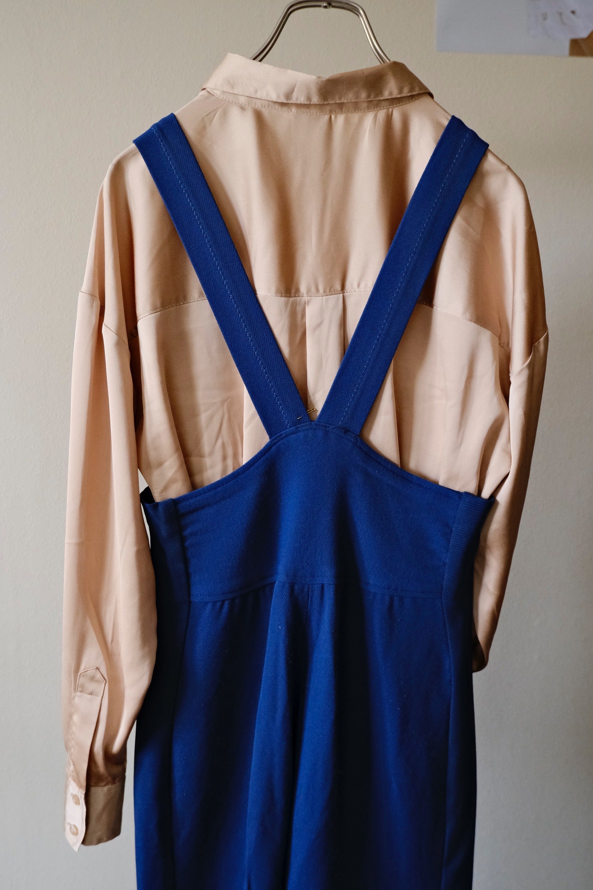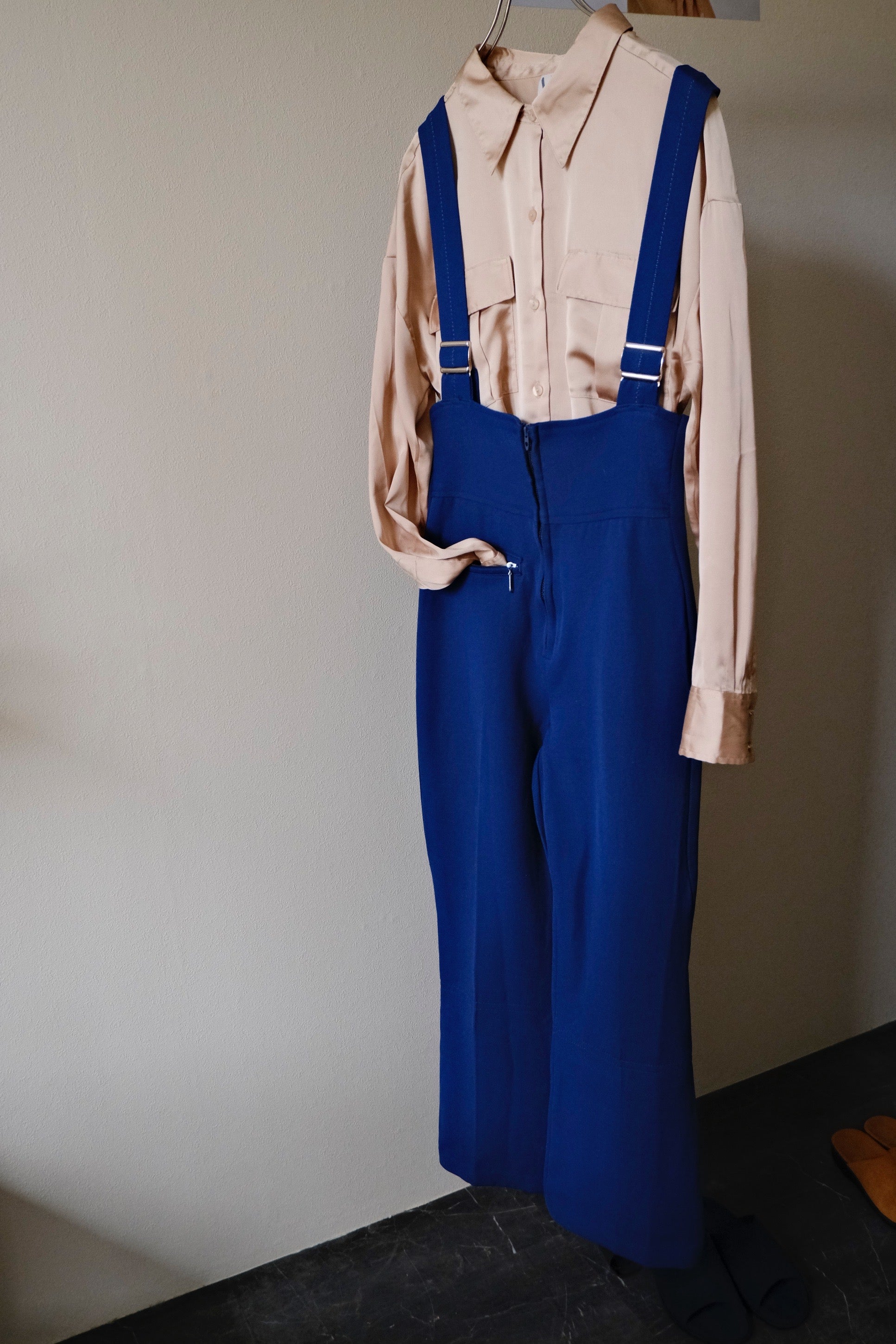 胸下からハイウェストなデザインになっているヴィンテージのオーバーオール。伸縮性があり、中にはトレンカのような作りが潜んでいるヴィンテージならではのデザインです。