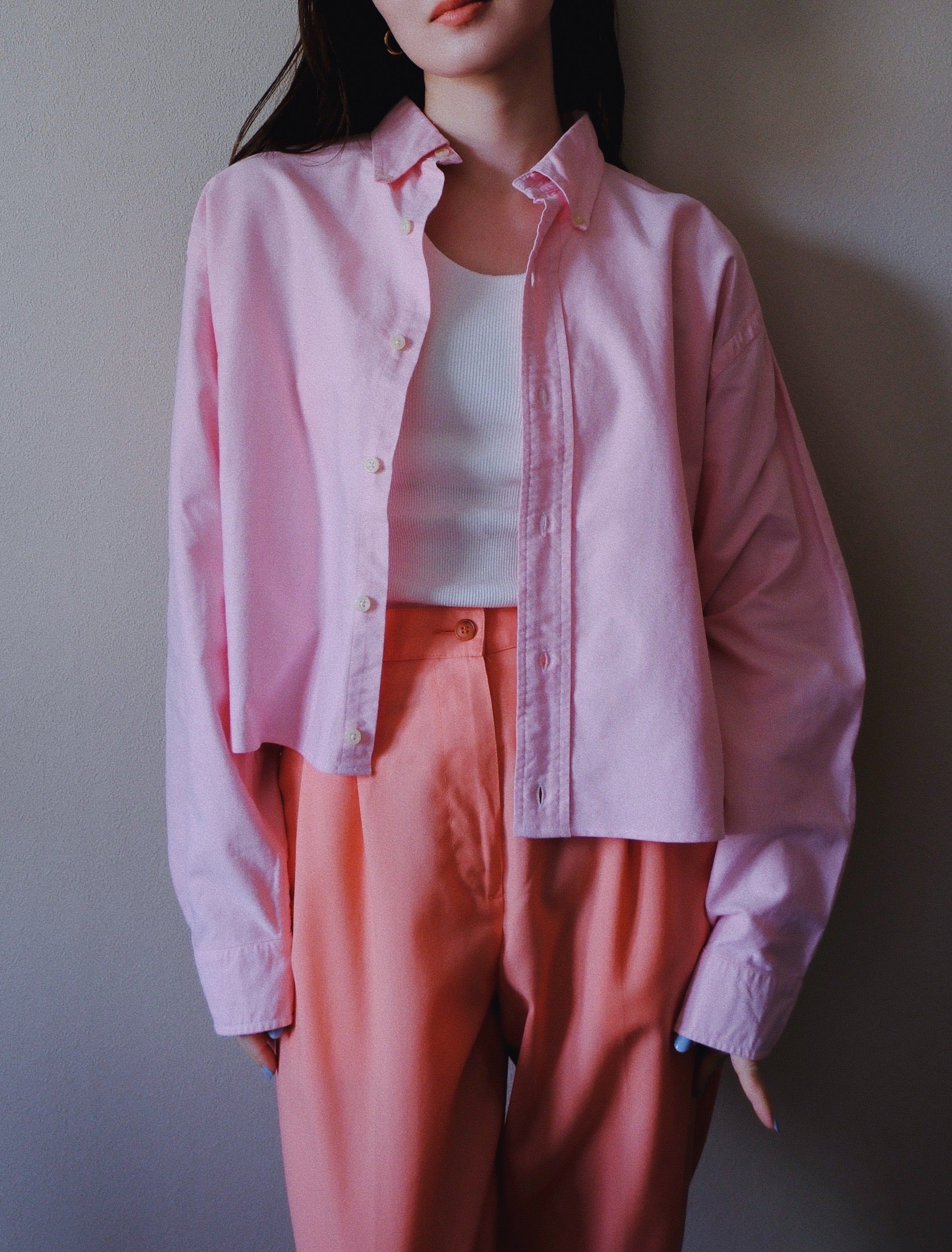 メンズのシャツをリメイクして、レディースでバランスがとりやすいように丈を短くしています。袖はそのままメンズサイズです。ハイウェストのボトムスやワンピースに重ねるのがおすすめ。