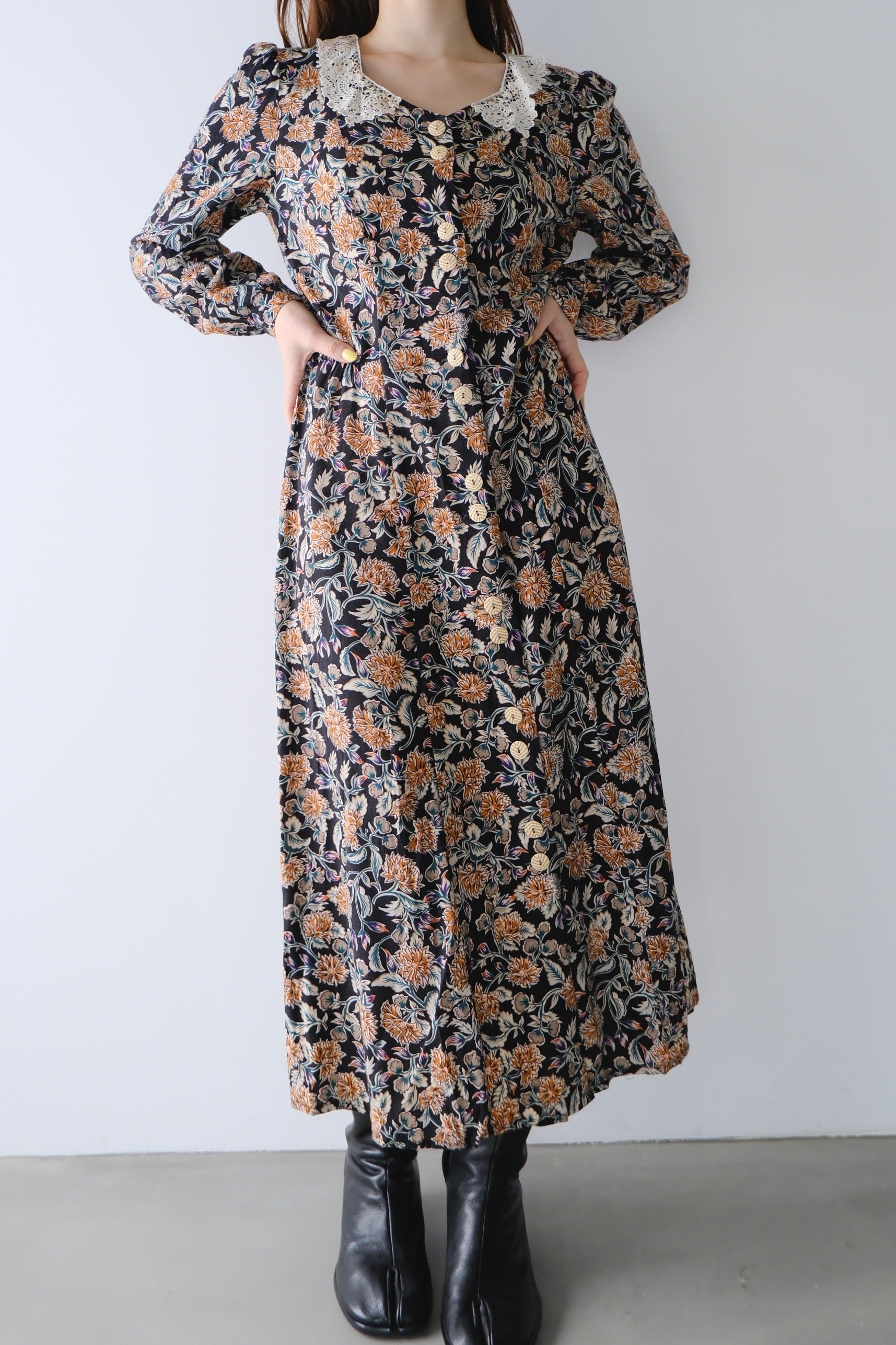 夢のような花柄が広がるヴィンテージワンピース。襟がレースになっているのもロマンチックでたまりません。腰紐はありませんが、紐を通すところがあるのでベルトでウエストマークもできます。